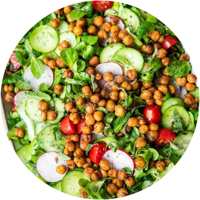 2. Top the greens with sliced cucumbers, radishes, grape tomatoes, and roasted Za’atar chickpeas.