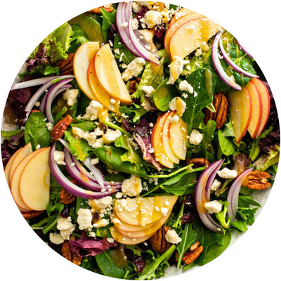 2. Top the greens with sliced red onion, chopped apple, crumbled feta or goat cheese, dried cherries, and the candied walnuts or pecans.