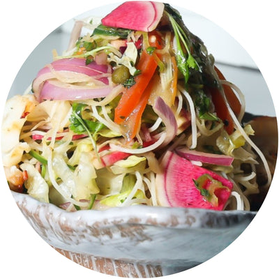 1. Prepare and combine Napa cabbage, red cabbage, lettuce, carrots, almonds or sunflower seeds, green onions, cilantro, chicken or shrimp, and pea pods in a large salad bowl.